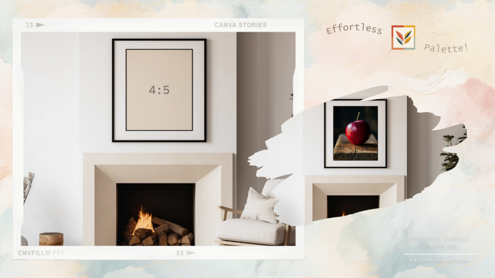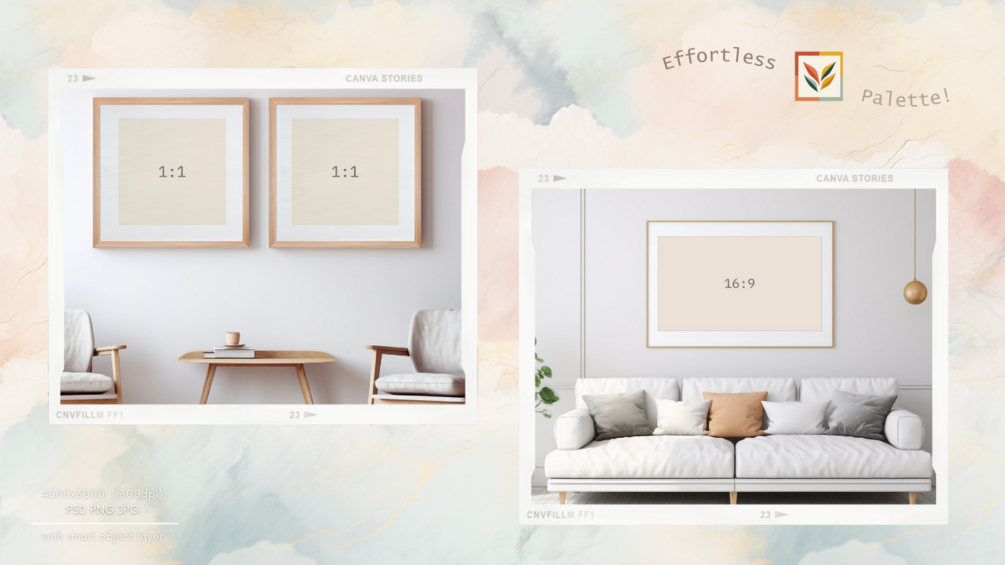 Get 8 premium frame scene mockups to enhance your artwork presentation. These scenes boast natural lighting and shadows for a realistic touch. Customize brightness, contrast, and more to seamlessly integrate your artwork into each scene.